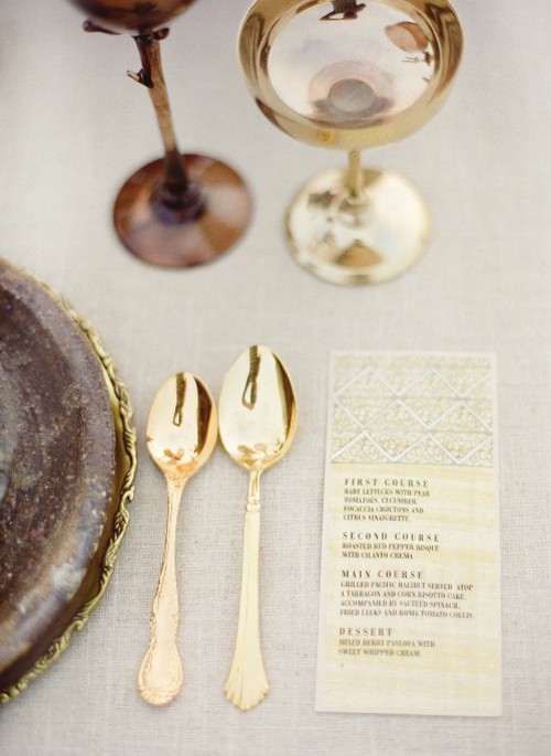 Gold is Glam. And Sexy. And Bold. And Traditional. But it can also be romantic and sweet! I am a BIG fan of bling, of gold, and I love these touches shown above of gold in unexpected elements and shown being both modern and sweet! What do you think?